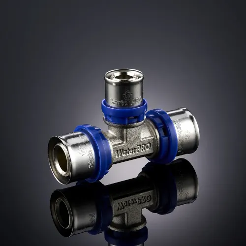Конструкция пресс-тройника WaterPro предусматривает два соосных патрубка под трубу одного диаметра и третий под меньший или больший диаметр — в зависимости от конфигурации. Все соединения выполнены по пресс-технологии с использованием нержавеющих гильз AISI 304, которые обеспечивают надёжную и долговечную фиксацию трубы.